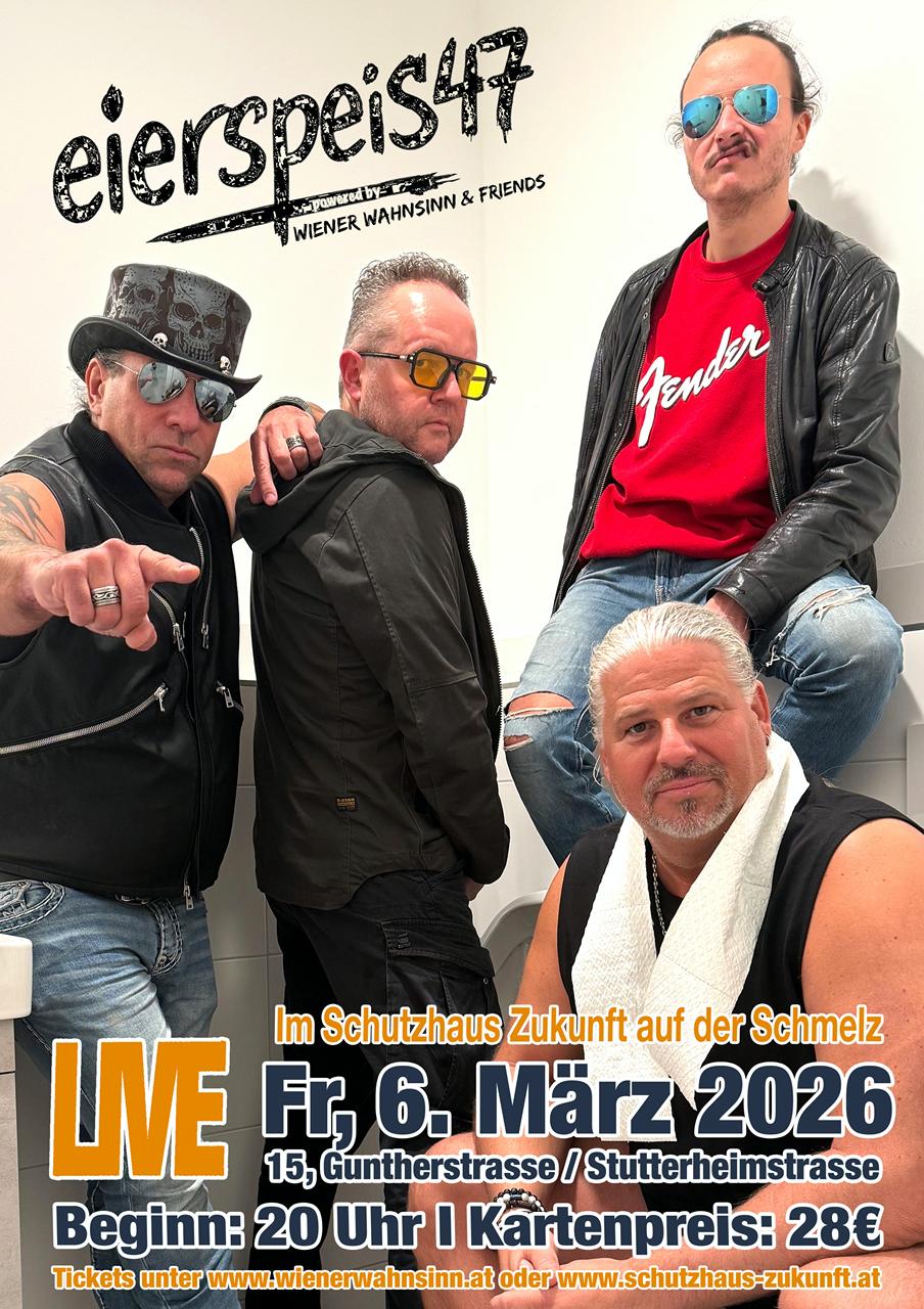 eierspeis47 hat eine klare Mission: raus aus dem Alltag, rauf auf die Bühne – mit viel Spaß, Wiener Schmäh und ehrlichem Rock’n’Roll. Euch erwartet ein Wunschkonzert mit unseren liebsten Rocknummern der 80er und 90er – live, energiegeladen und auf Englisch.